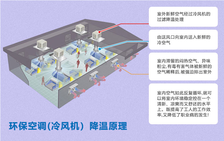 在空氣不流通的環(huán)境中,尤其是化工車間,容易產生建筑綜合癥,如悶熱、頭疼、眩暈、過敏、咳嗽等不適癥狀。使用環(huán)保空調(冷風機)通風降溫方案即可以有效降溫,又能保證空氣流通